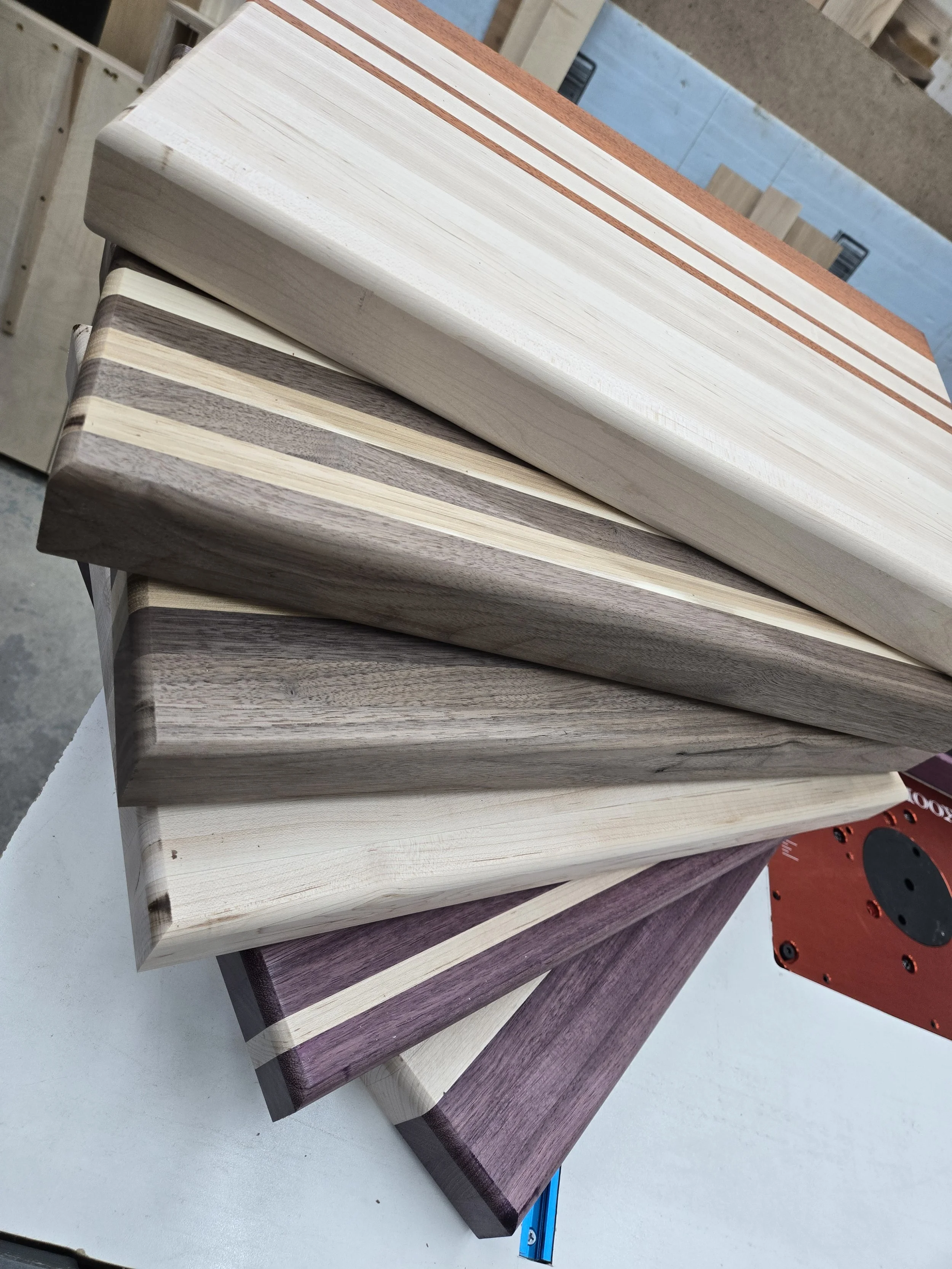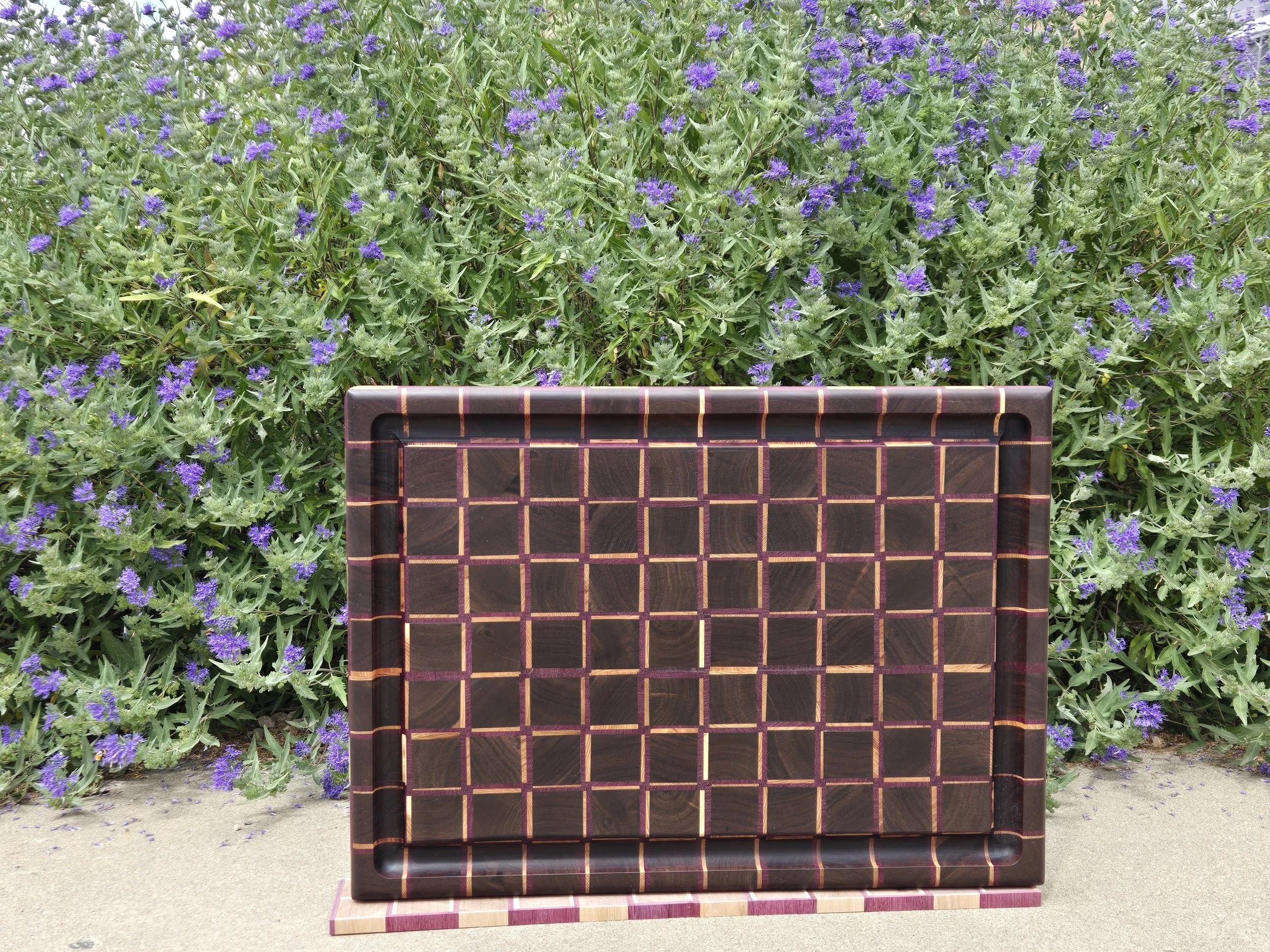 This functional reversible, meaning it can be used on both sides for all your food prep needs, and it is a beauty that will look amazing in your kitchen! This is an edge grain cutting board made from Maple and Purple Heart. It measures 18 1/2” x 10 1/2” x 1 1/2”
